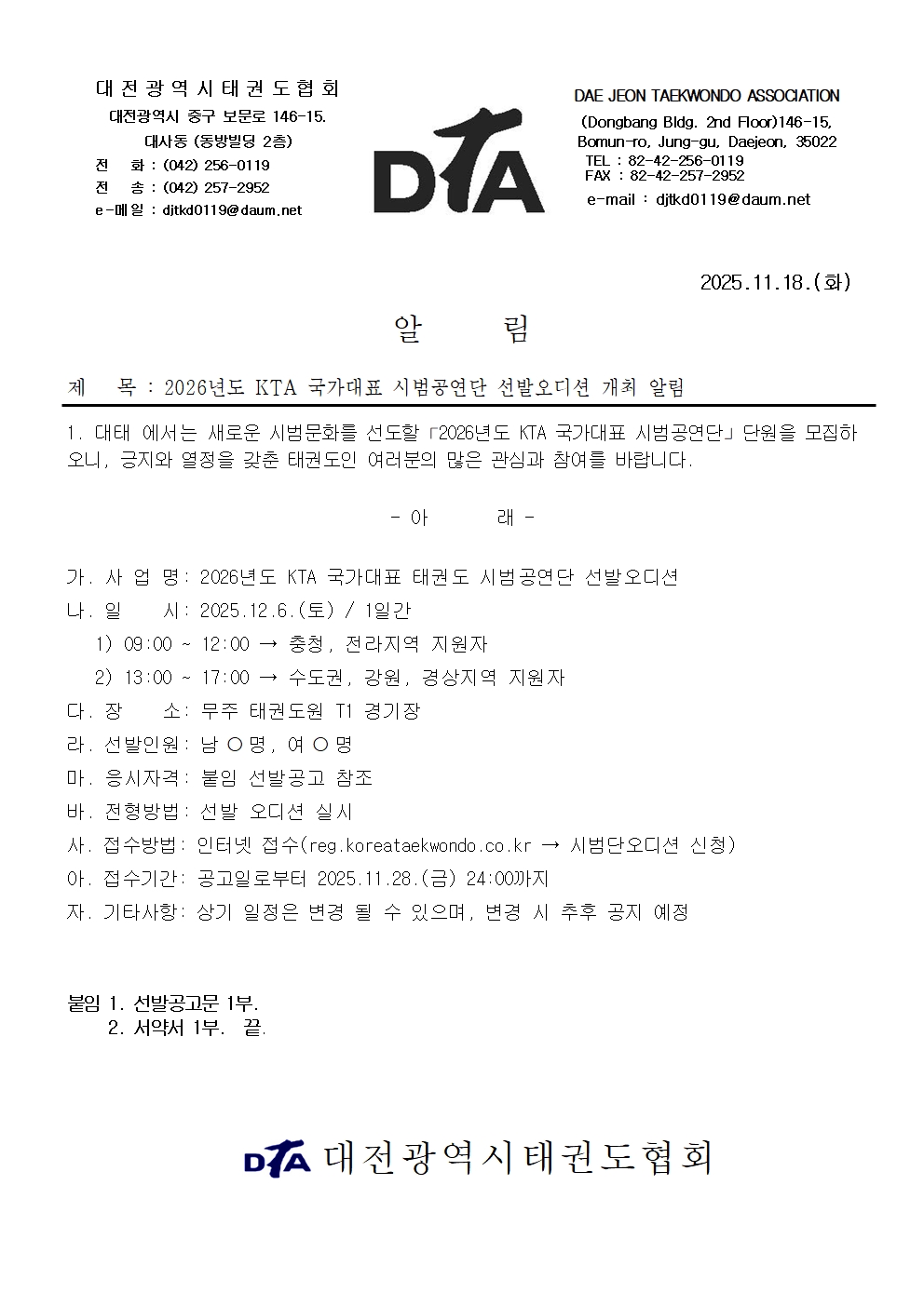 | 공지 | ![]() | 대전시태권도협회 | 119611 | 2022년 2월 15일 |