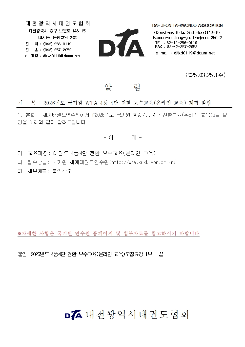 | 829 | 제2차 KTA지도자 전문교육과정 개최안내 c image | djtkd0119@daum.net | 369 | 2025년 9월 19일 |