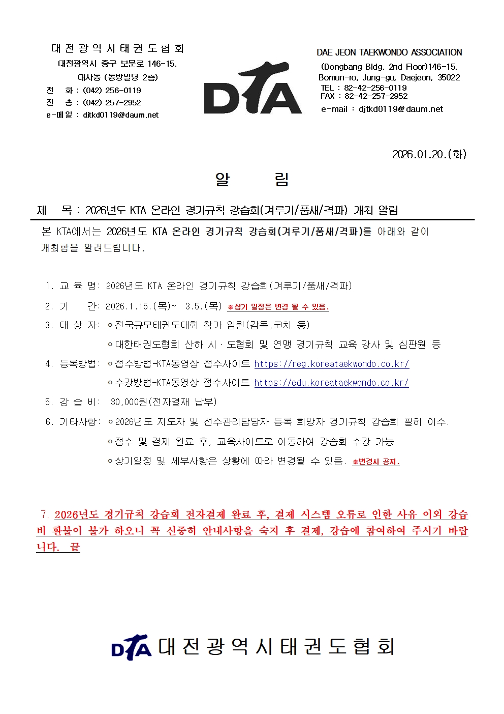| 844 | 2026년도 대전협회 경기규칙강습회(겨루기.품새)개최 안내 c image | djtkd0119@daum.net | 1266 | 2026년 1월 13일 |