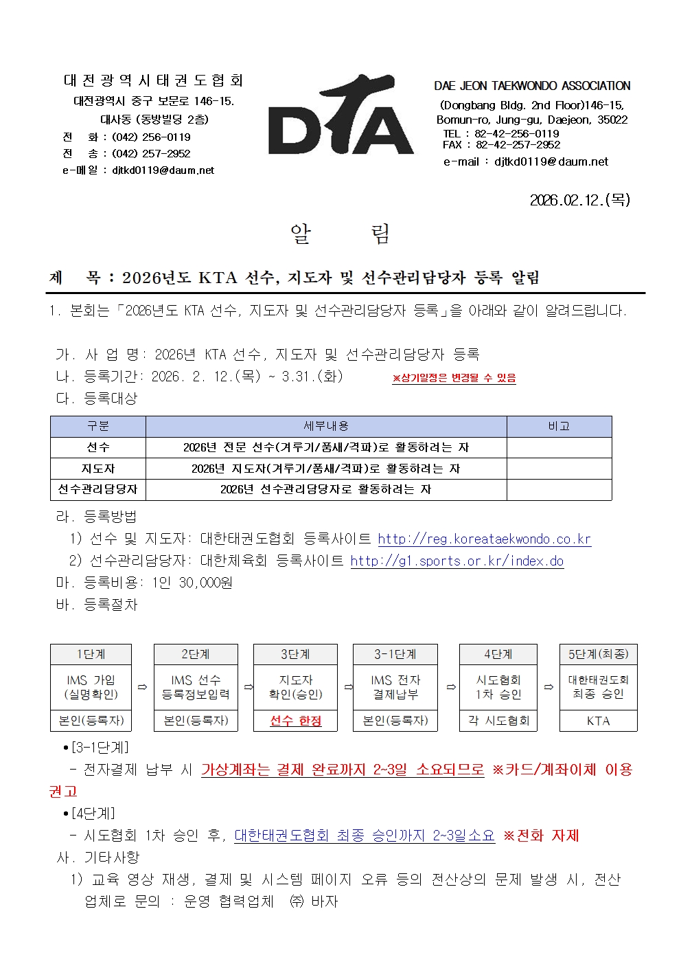 | 공지 | ![]() | 대전시태권도협회 | 133022 | 2022년 2월 15일 |