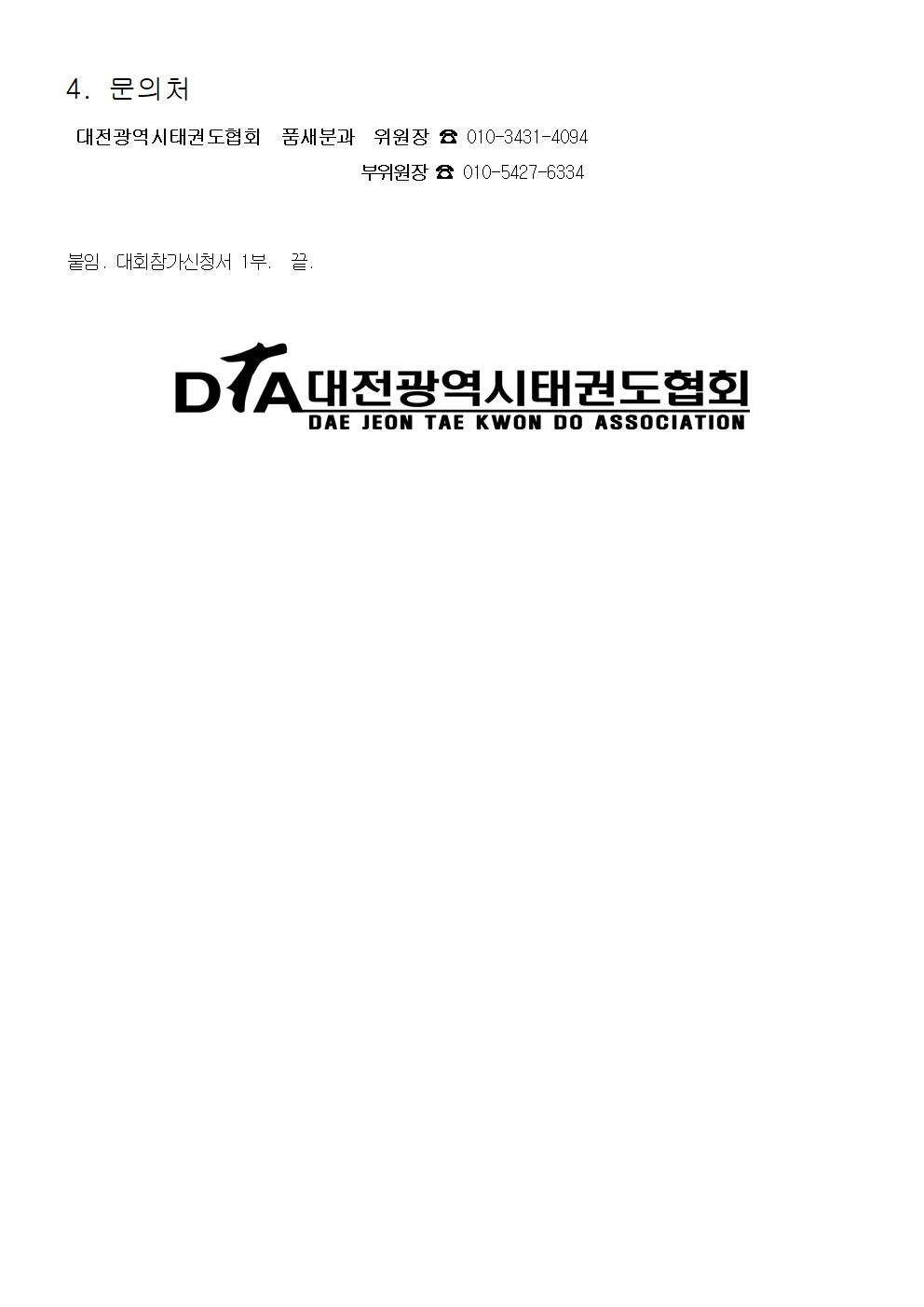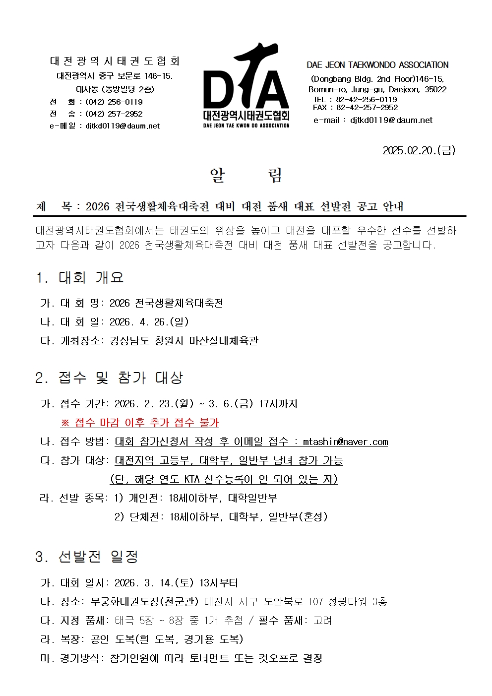 | 공지 | ![]() | 대전시태권도협회 | 134240 | 2022년 2월 15일 |