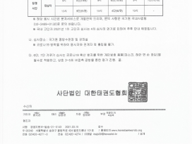 ✔ 본 협회는 심사대회중 상해에 대비하여 단체 상해보험에 가입할 예정이며, 심사 응시자들은 보험계약의 체결, 유지관리 등의 목적에 필요한 개인정보를 개인정보 보호법 제15조(개인정보의 수집·이용) 및 제17조(개인정보의 제공) 활용에 동의한 것으로 한다. 보험에 가입하기 위해 얻은 개인정보는 개인정보 보호법 제21조에 따라 심사대회가 끝나는 날부터 일주일 이내에 영구삭제 또는 파쇄(소각) 시키는 것으로 한다.